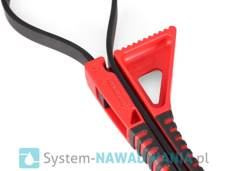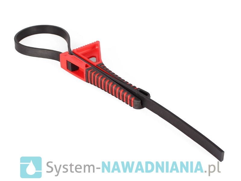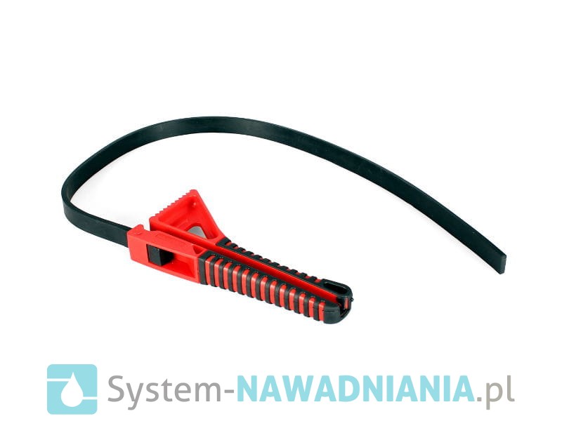 Pasowy klucz do dokręcania złączek PE o średnicach od 20 mm do 110 mm. Nadaje się do pracy ze wszystkimi złączkami skręcanymi, niezależnie od producenta (Irritec, Fish, Plastica Alfa, Unidelta, ...). Pas wykonany jest z gumy, która zapewnia bardzo wysoką przyczepność, a rozmiar pętli można płynnie regulować, dzięki czemu klucz nie ślizga się po nakrętce. Klucz pozwala zaoszczędzić czas, siłę i zdrowe, a przy większych średnicach złączek jest niezbędny do prawidłowego dokręcenia połączeń. Narzędzie wykonane jest z bardzo wytrzymałych materiałów, łatwo się je czyści, nadaje się do pracy w trudnych warunkach.