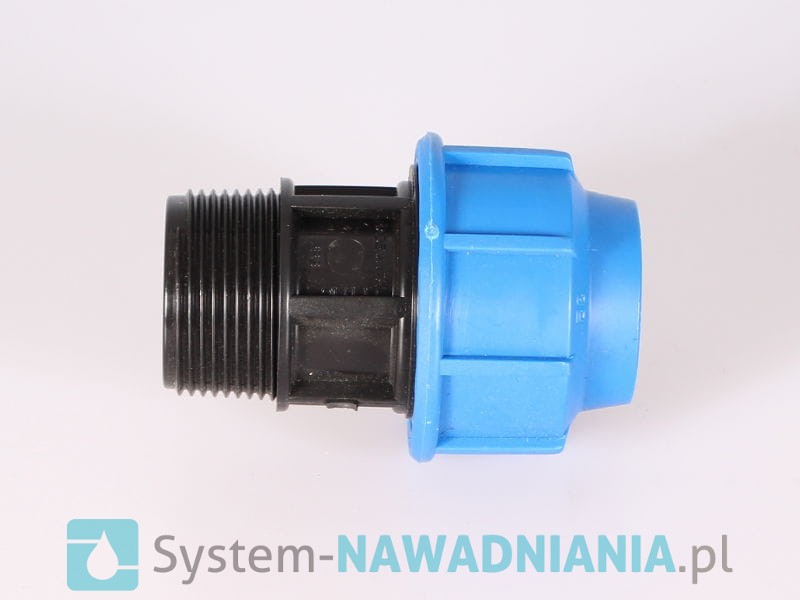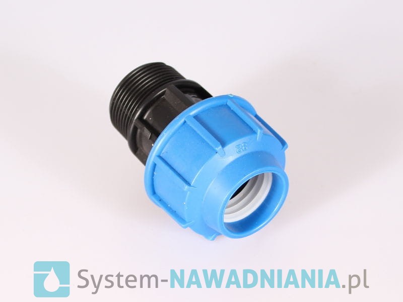 Przeloty skręcane z gwintem zewnętrznym firmy Plastica Alfa 32 mm - 1 1/4 cala (niebieska nakrętka). Przelot daje możliwość połączenia rury z innymi elementami systemu podlewania, takimi jak zawory, pompy, itp.