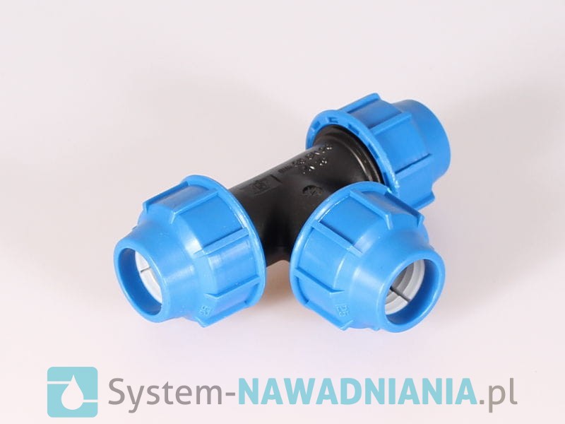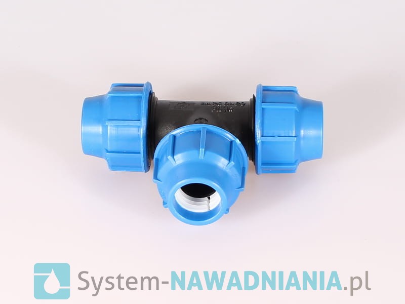 Trójnik skręcany firmy Plastica Alfa 25 mm - 25 mm - 25 mm (niebieska nakrętka), bardzo często stosowany w przydomowych systemach nawadniania.