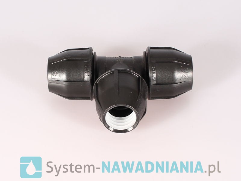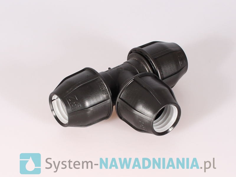 Trójnik skręcany firmy Fish 32 mm - 32 mm - 32 mm (czarna nakrętka), bardzo często stosowany w przydomowych systemach nawadniania.