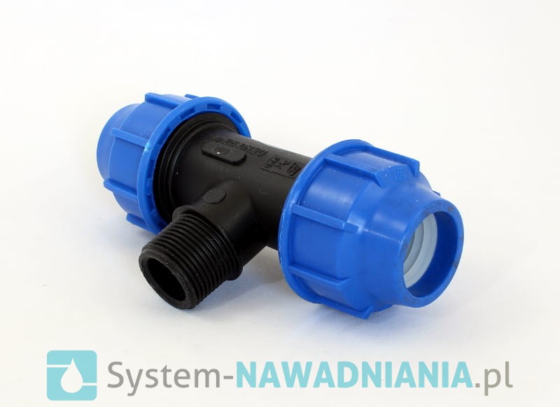 Trójnik skręcany z gwintem zewnętrznym firmy Plastica Alfa 25 mm - 3/4 cala - 25 mm (niebieska nakrętka).