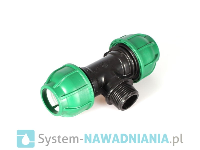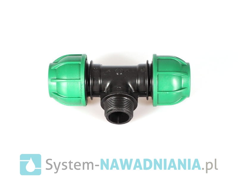 Trójnik skręcany z gwintem zewnętrznym firmy Irritec 32 mm - 1 cal - 32 mm (zielona nakrętka).